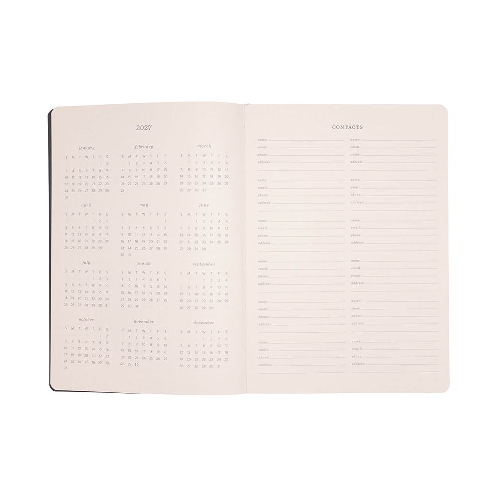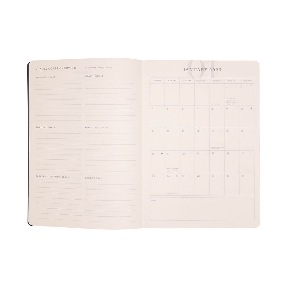 Set your monthly goals. important to-dos. birthdays. anniversaries. and more to stay organized throughout the year! This 12-month dated weekly planner (Jan. 2026 – Dec. 2026) features a soft faux leather cover with exclusive artwork by Megan Galante and metallic gold foil accents. Includes monthly grids. weekly planning pages. lines for notes and weekly to-do lists. and a ribbon bookmark to easily keep track of your days.