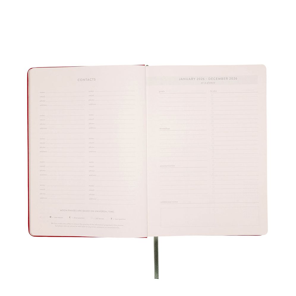 Set your monthly goals. important to-dos. birthdays. anniversaries. and more to stay organized throughout the year! This 12-month dated monthly planner (Jan. 2026 – Dec. 2026) features a flexible faux leather cover with matte cream foil design and an elastic band closure. Includes monthly grid spreads for planning. lined notes pages. and a ribbon bookmark to easily keep track of where you left off. Interior front cover also features useful conversion charts and world times.