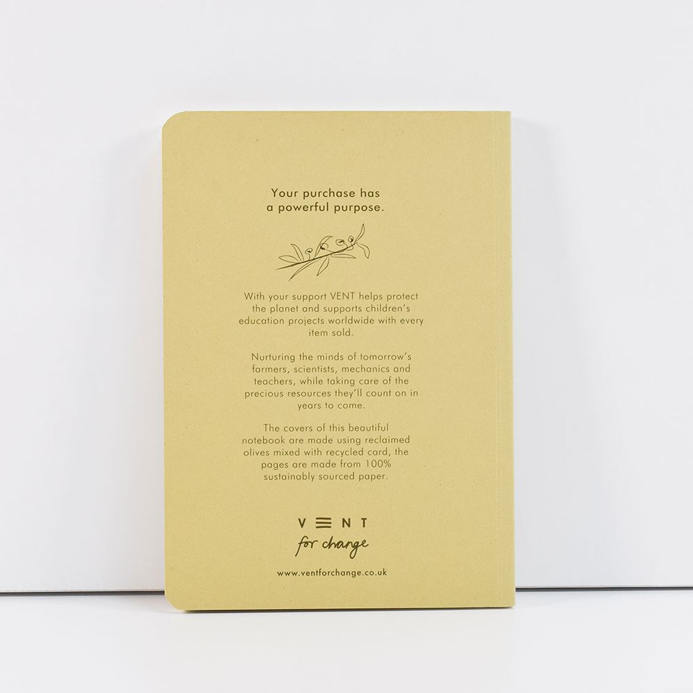 A5 journal / notebook made with reclaimed Olive waste (covers) and certified sustainable paper. 120 pages of 100gsm lined off-white paper and stylish rounded corners. Semi-rigid / flexi covers. Illustrated cover designs.