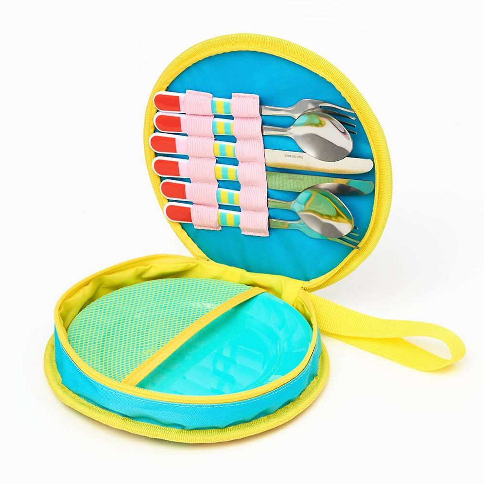 This bright and fun picnic set will keep you looking stylish and organized at your next picnic. Great for on-the-go. this picnic set features a fun coral pattern and includes 2 plates. 2 forks. 2 knives and 2 spoons.