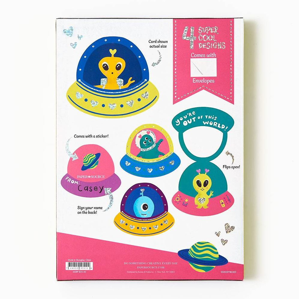 These adorable aliens are sure to please any recipient! They each come in their own little space ship and all have a unique design! Set of 28 and comes with white envelopes. Cards are 3.5 x 4. Designed by Paper Source.