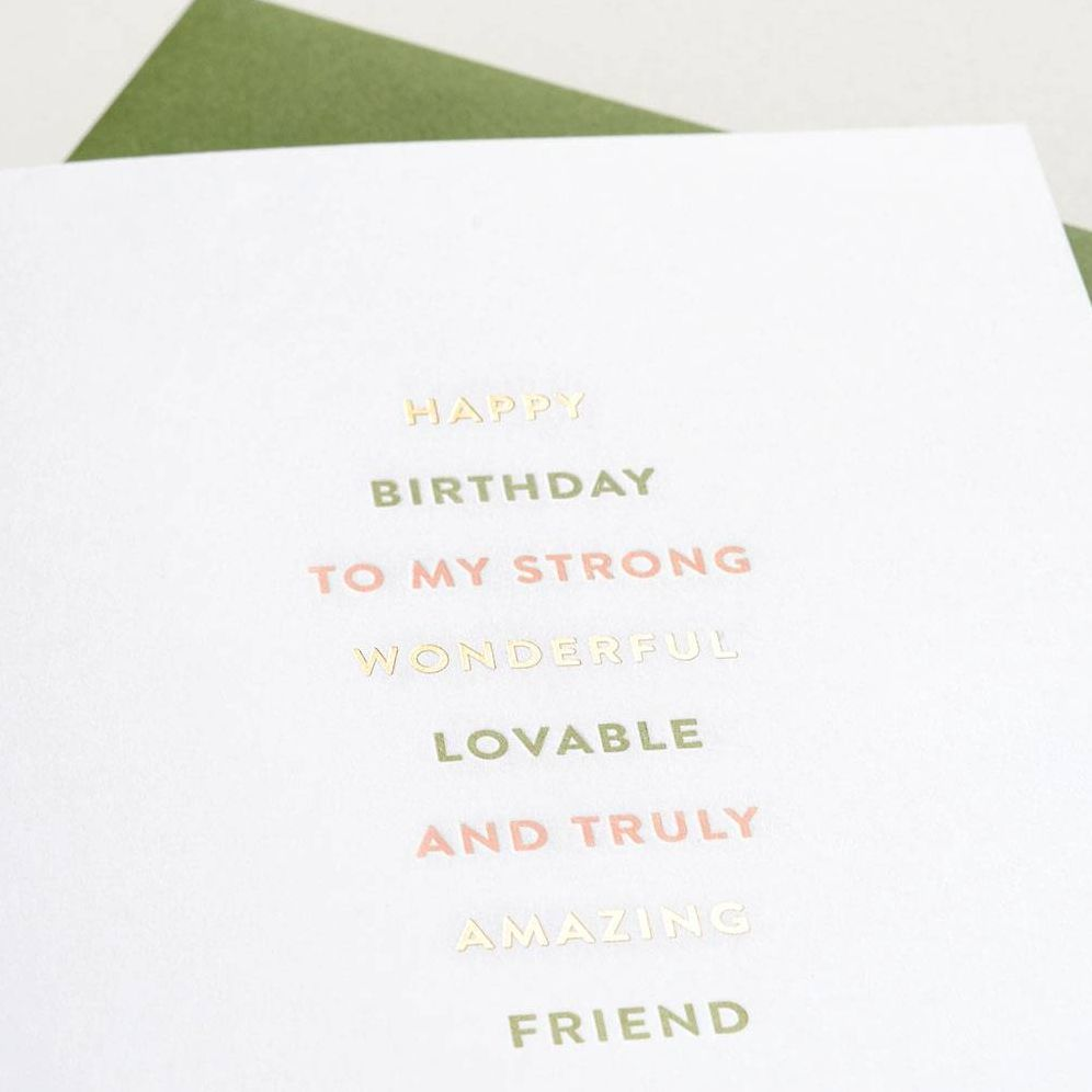 Truly amazing friends deserve truly amazing birthday cards. This one is letterpress printed with gold foil and features the message. Happy Birthday to my strong. wonderful. lovable. and truly amazing friend. Folded card. Blank inside. Accompanied by moss green envelope. By Sugar Paper.