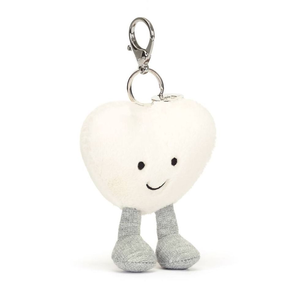 Wherever you go. wear your heart on your bag! The Amuseables Cream Heart Bag Charm is a gorgeous pop of soft cream with silver glittery cord boots. With a silver claw clip and Jellycat tag. this bright-eyed pal suits any purse or backpack. A little love goes a long. long way.