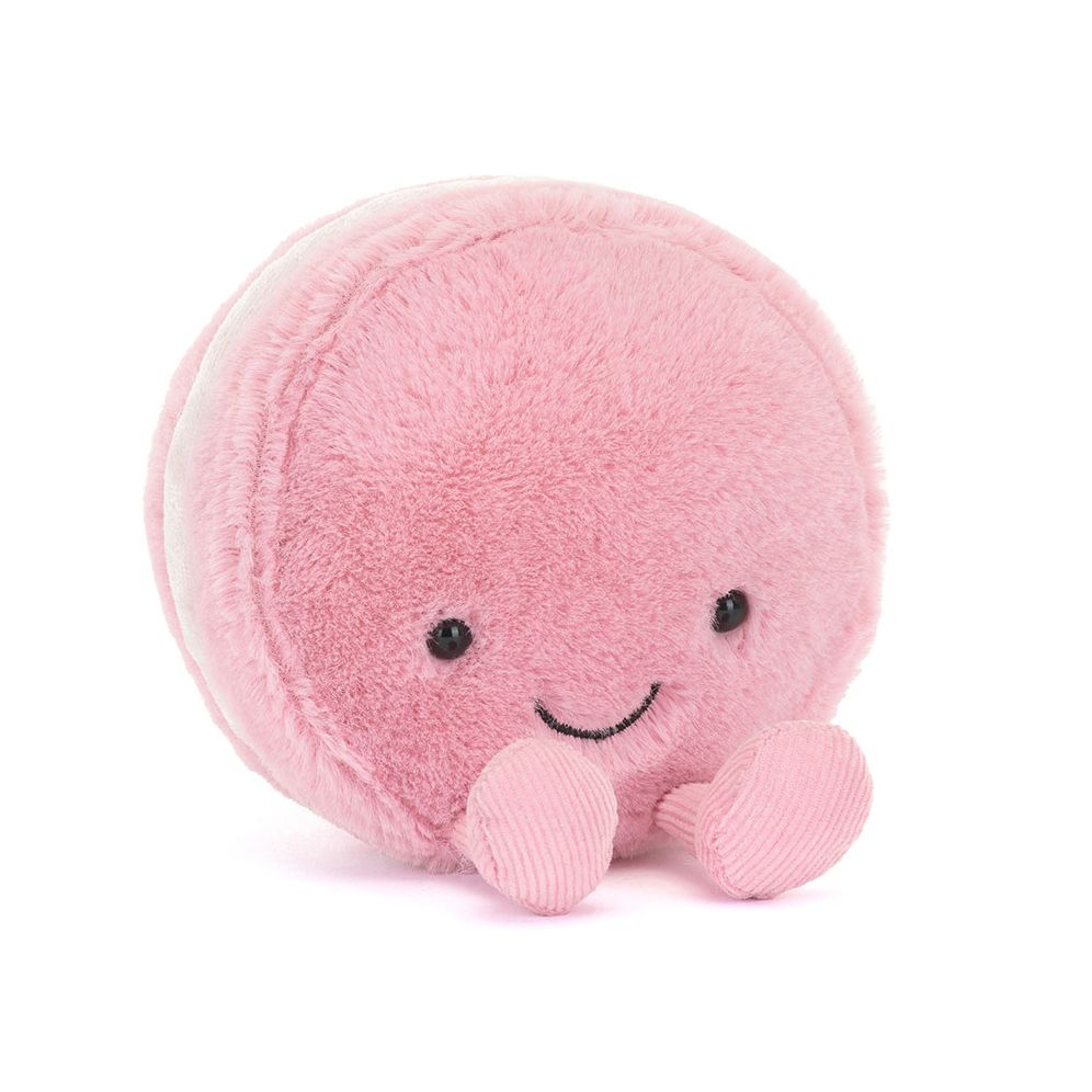 Amuseables Mia Macaron is a fruity. friendly treat in soft strawberry fur. With a velvety filling. matching cord feet. and stitched smile. Mia has an embroidered Jellycat logo on the back for a truly luxurious treat!
