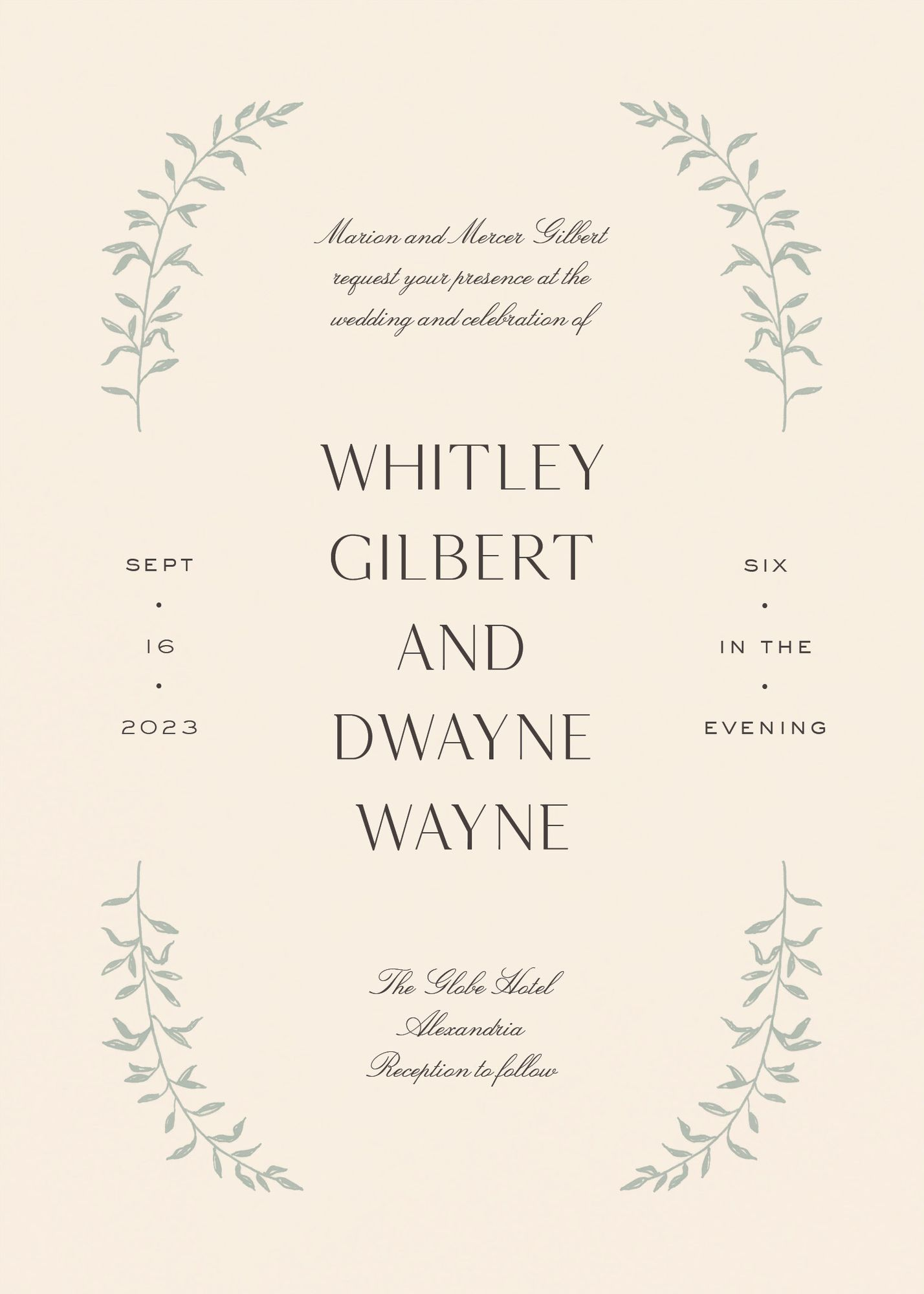 Mirrored type and greenery branches adorn this classic design by Paperless Post. Printed on Mohawk superfine white 130 lb. card stock that is soft to the touch and matches our superfine white envelopes. This paper is FSC certified. with 30% post consumer recycled content. and made using wind power. Need to send your annoucement ASAP? You can send with our partners at Paperless Post.