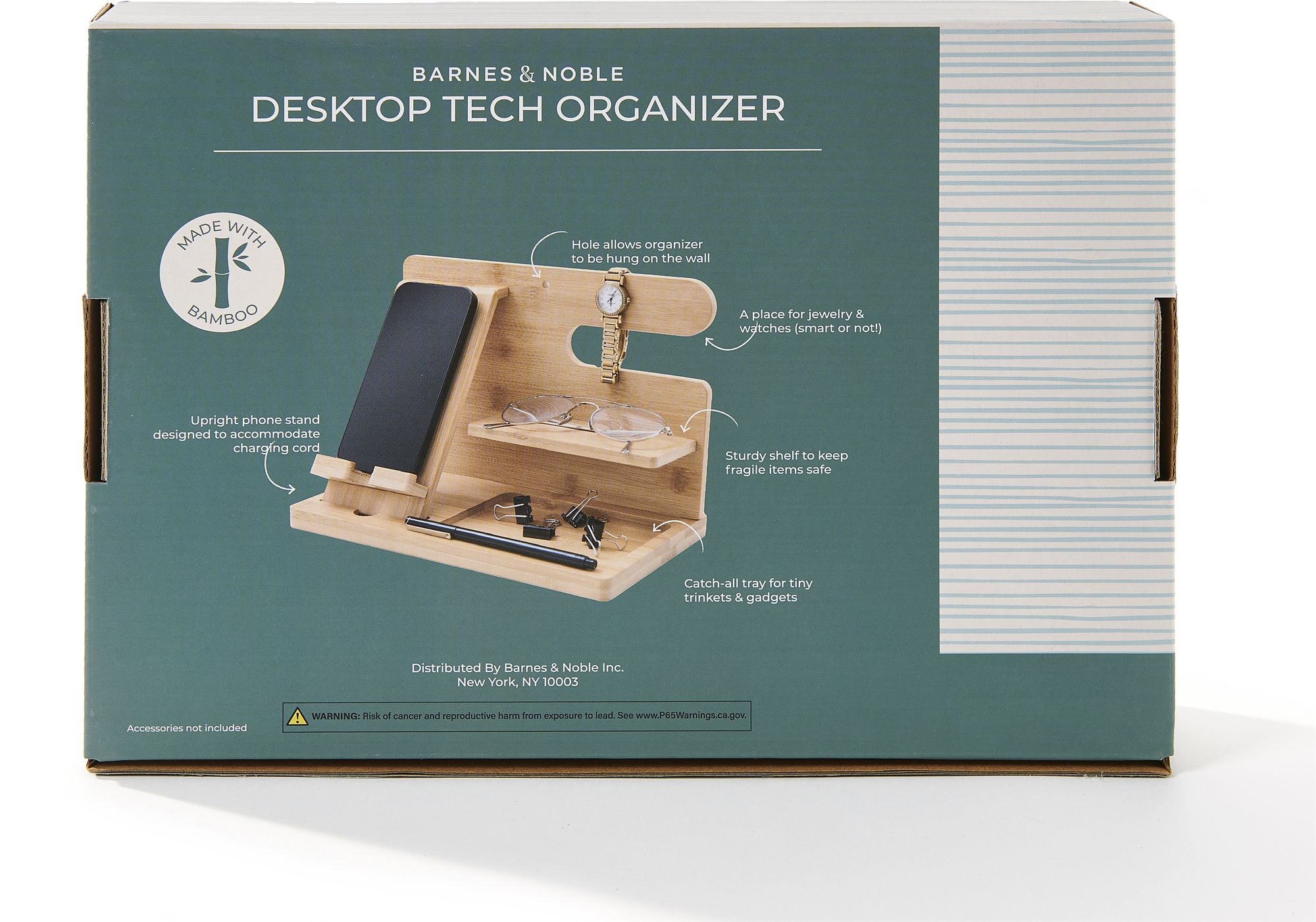 An upright phone stand designed to accommodate a charging cord. with a dedicated space for jewelry and watches. Includes a sturdy shelf to keep fragile items safe. plus a small tray for organizing tiny trinkets and gadgets.