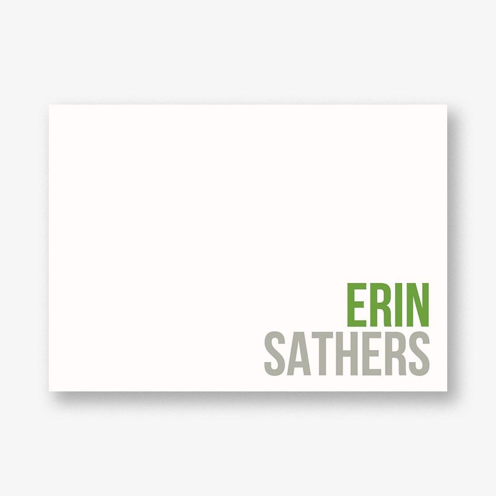 Bold lettering in the colors of your choice. lends a modern. casual feel to this fresh stationery design. Printed on superfine white paper. which has a smooth finish and is soft to the touch. 130# cover weight paper with 30% post consumer recycled content.