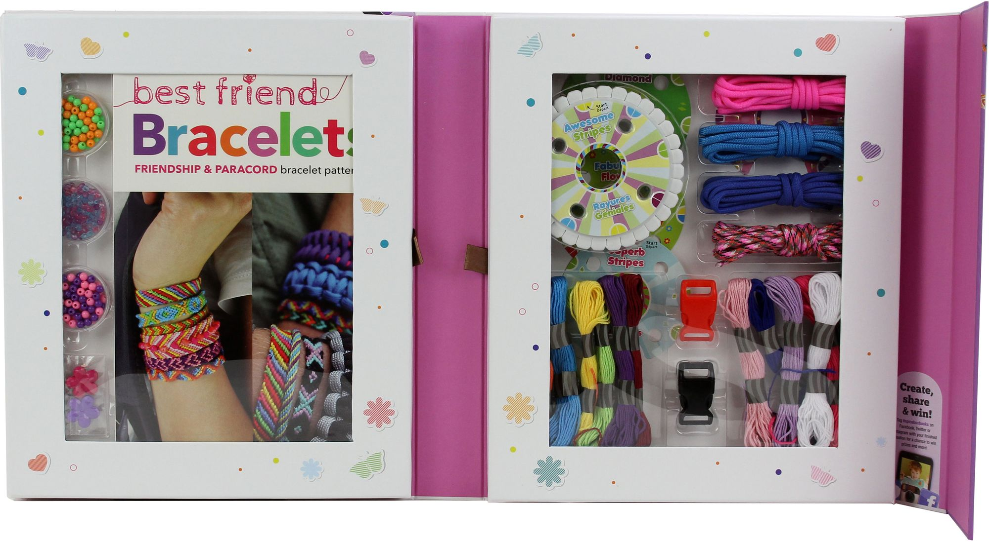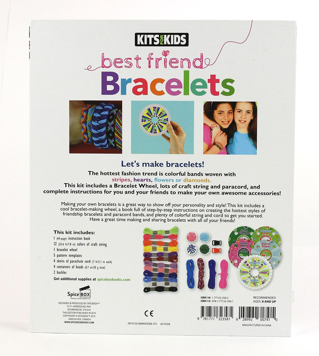 This kids Friendship Bracelet Kit comes with an easy to use wheel. making it simple and fun to quickly create stylish threaded jewelry! The hottest trend in friendship bracelets are colorful cords woven with stripes. hearts. flowers or diamonds. and you will learn all these techniques and more. The instructions are clear and simple to follow. and in no time you and your friends will be making fabulous friendship bracelets that you can wear and share.This Friendship Bracelet Kit Includes:- 1 Instruction book- 12 Colors of Craft String- 4 Skeins of Paracord – 5 Bracelet Templates & Patterns- 1 Bracelet Wheel- 4 Containers of Beads- 2 Buckles For Ages: 8+ WARNING: Choking Hazxard. Small Parts. Not For Children Under 3