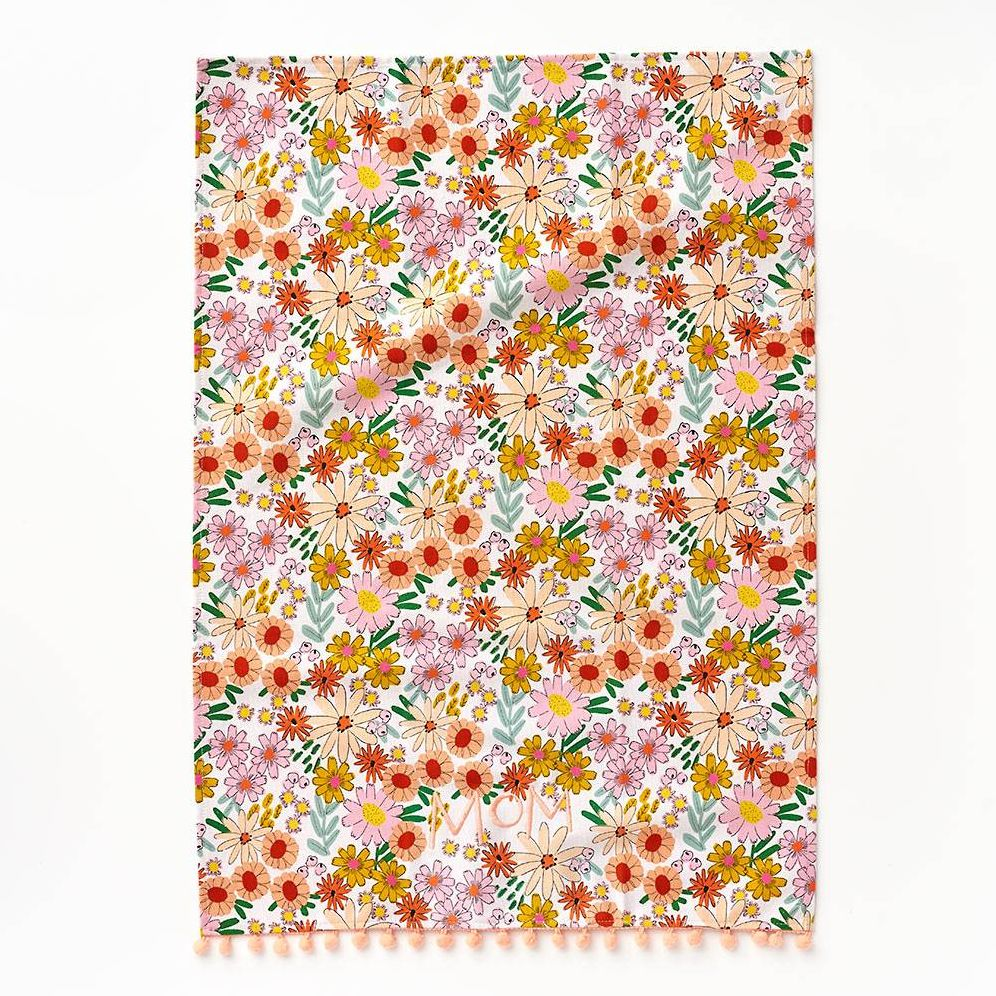 100% cotton tea towel with embroidered design accent and pom pom trim.