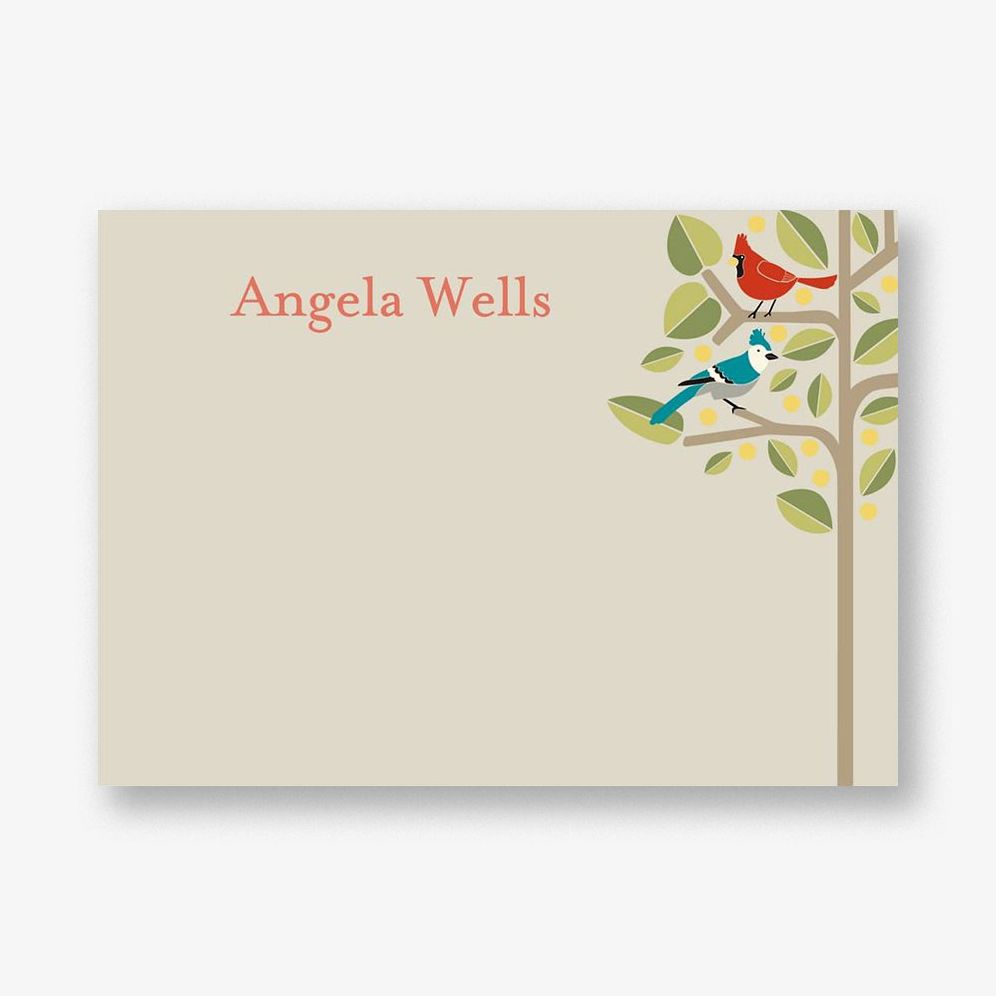 Colorful birds in a graphic tree delightfully frame this stationery design. making letter writing a pleasure! Printed on superfine white paper. which has a smooth finish and is soft to the touch. 130# cover weight paper with 30% post consumer recycled content.