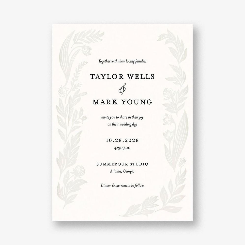 Chic and modern. simple but striking. and botanical yet bold; these invitations feature a stunning monochromatic floral design adorned with shimmering foil.