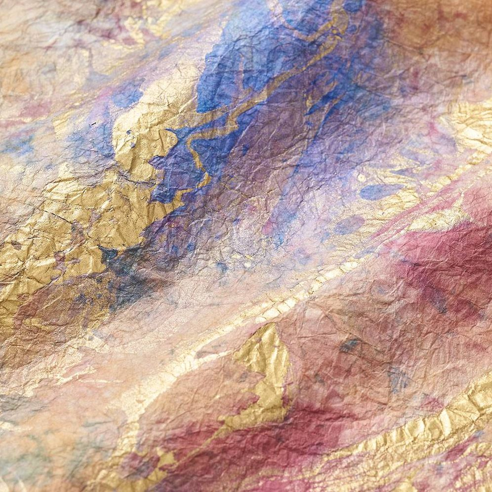 Subtle and sophisticated colors of blue and purple blend softly together. while accented with rich metallic gold swirls. With a crinkled texture that is as ?Ç£soft as bed sheets?Ç¥. this hand marbled momi paper is a favorite for book arts. fine art use and craft applications. Our momi?ÇÖs are also great for stitching applications used in altered arts and collage. These Thai momi marbled papers are initially machine made from kozo and bamboo pulp. then hand-marbled and crumpled using the following technique. Oil-based paints are added to a tub of water. The paint. which floats atop the water. is moved around to create a swirling pattern. The base sheet of paper is then laid atop the water. grabbing the swirling paint pattern. then quickly removed. The sheet is then set aside to dry. Once dry. additional colors are added using the tie-dye process. The sheet is then crumpled to produce it?ÇÖs soft cotton-like feel. and set aside to dry once more. This artistic technique creates a unique one-of-a-kind design each time. Please note: Given the delicate nature of fine paper. all flat paper purchases are final sale.