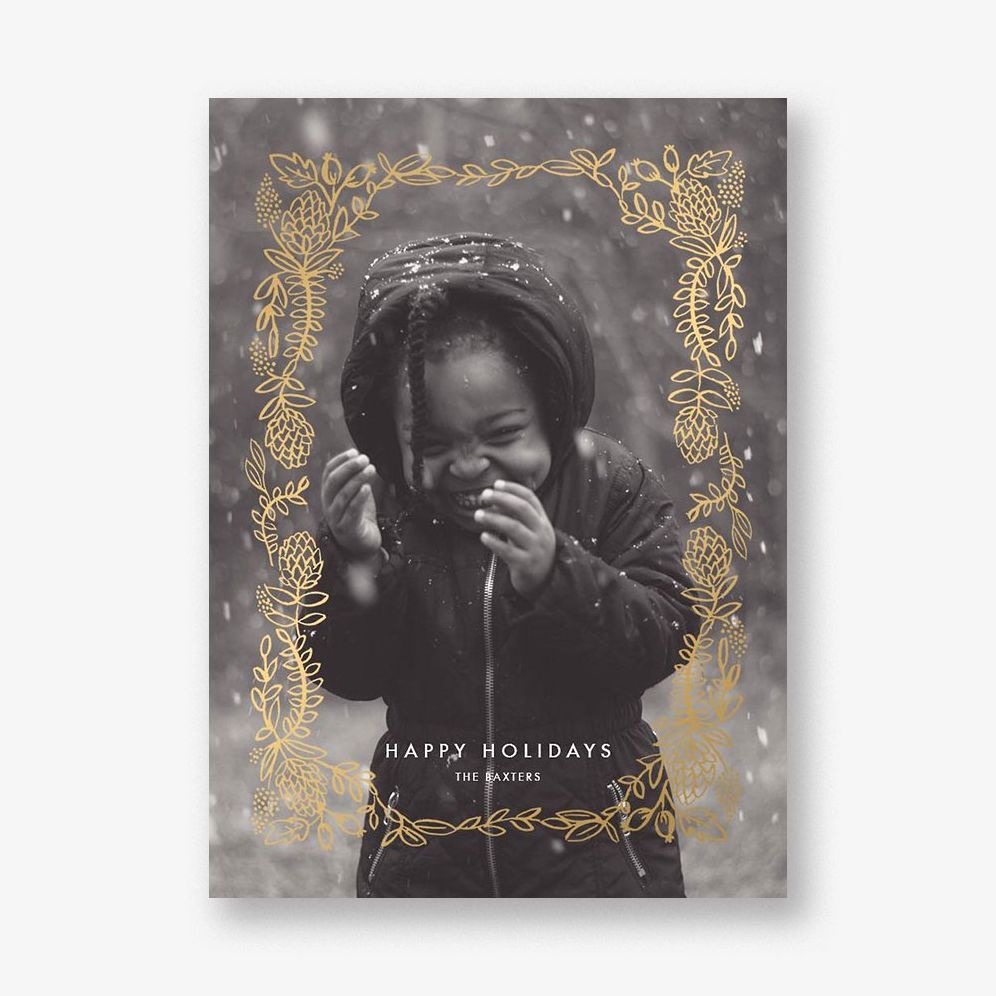 This Rifle Paper Co. for Paperless Post foil design frames beautiful around a custom family photo and makes for a great holiday photo card! Foil options include rose gold. gold and silver.