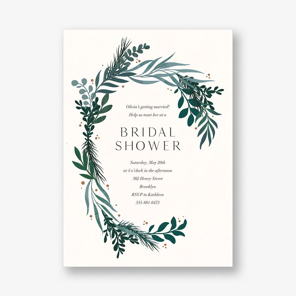 A bunch of botanical branches in glorious greens wreaths this invitation to celebrate those to-be-wed!