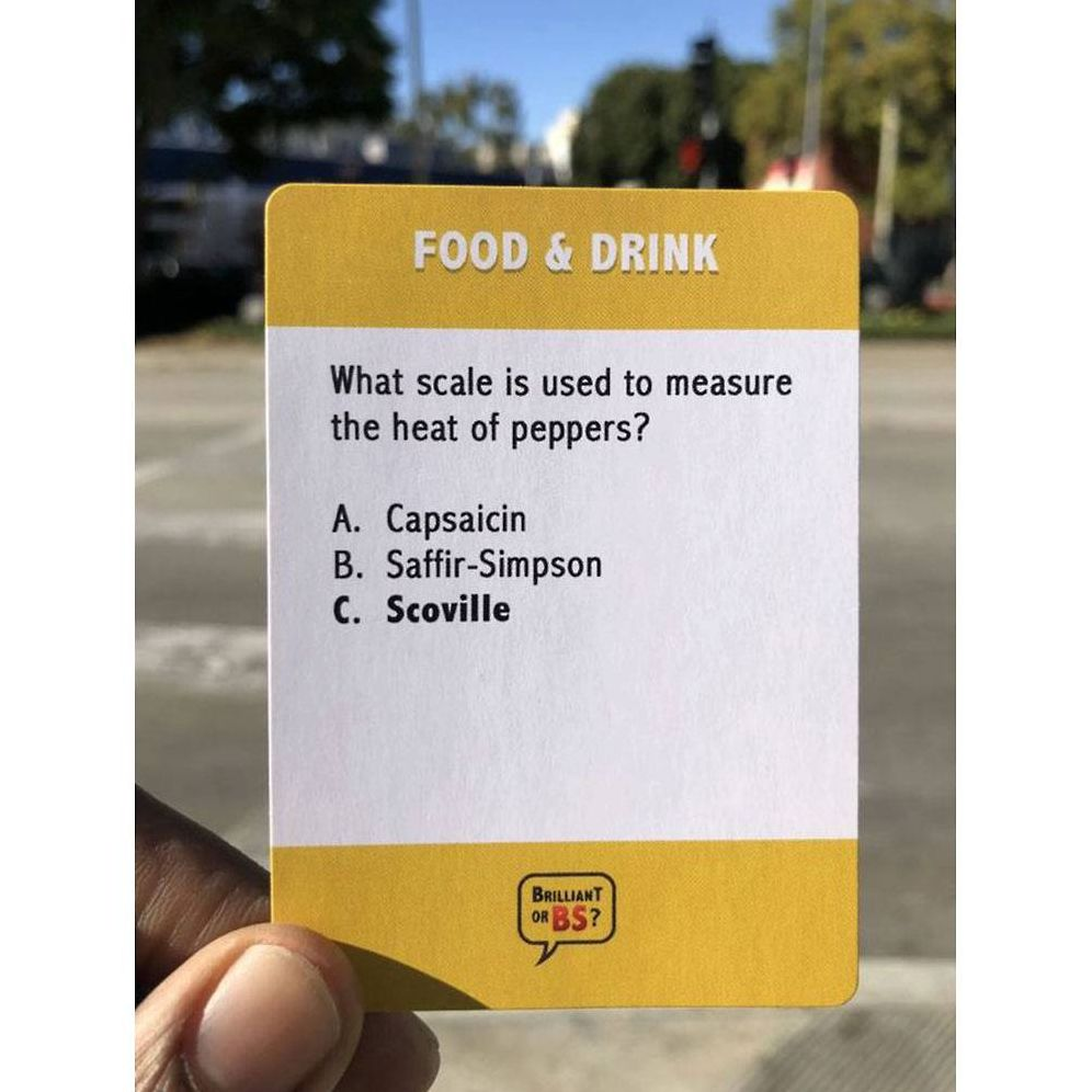 Brilliant Or BS? is a 4-6 player party game for know-it-alls and big fat liars! Players read multiple choice trivia questions and earn points by predicting which of the other players guessed correctly before answers are revealed. Can you tell when your friends are BSing? Play this hilarious party game and find out.There are six different categories of trivia including Sports. Entertainment. Food & Drink. Science & Technology. Geography and History.Players take turns being the Judge by reading one yellow question card and the three multiple choice answers.The other players have 10 seconds to respond by placing one of their A-B-C answer cards face down.Starting with the player to the Judge’s left and going clockwise. each player tries to convince the Judge that they got the question right without saying the answer. They must come up with a convincing explanation as to how or why they know the correct answer…even if they don’t.After everyone pleads their case. the Judge grabs the two black cards and gives the Brilliant card to the person they think got the question right and the BS card to the person they think got it wrong.The player that receives the Brilliant card automatically earns 2 points and the player who receives the BS card earns 0 points.The Judge announces the correct answer (highlighted in bold) before asking the other players to reveal their cards. The players who did NOT receive a Brilliant or BS card go first. followed by the player who received the BS card. The person who received the Brilliant card reveals their answer last. Each player that gets the question right earns 1 point.The Judge receives 1 point for each correct Brilliant prediction and 1 point for each correct BS prediction. But beware. For each wrong prediction. the Judge loses 1 point.Play continues until each person has had the chance to be the Judge the same number of times. The player with the most points at the end of the game wins. (Suggested length of game play is 1 hour.)For Ages: 14+WARNING: Choking Hazard; Small Parts. Not for children under 3 years old.