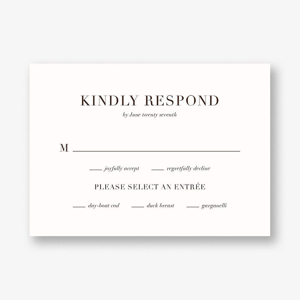 The Buckhannon Response card is a lovely accompaniment to the other pieces in the Buckhannons suite of wedding cards. Designed by Felix Doolittle for Paperless Post. Printed on Mohawk superfine white 130 lb. card stock that is soft to the touch and matches our superfine white envelopes. Paper is FSC certified and made using wind power.