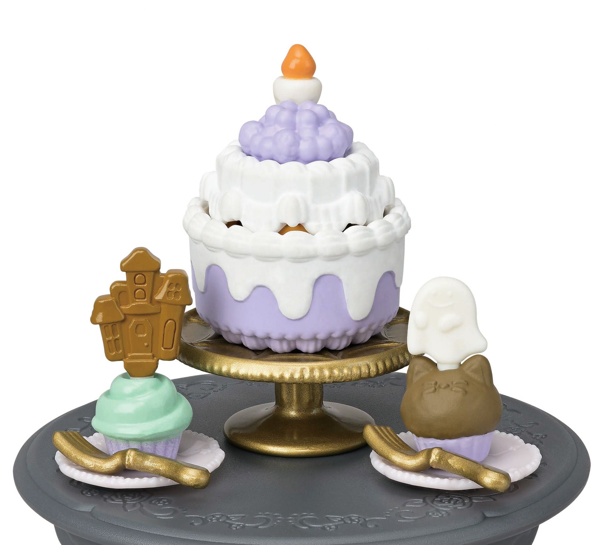 Calico Critters Halloween Surprise Party Set includes Persian Cat Girl Skye. Tuxeudo Cat Baby Peppermint and Midnight Cat Cradled Baby Reggie dresses in unique. removable Halloween costumes. Gather around the table for a Jack-O-Lantern Cake and sweet treats!