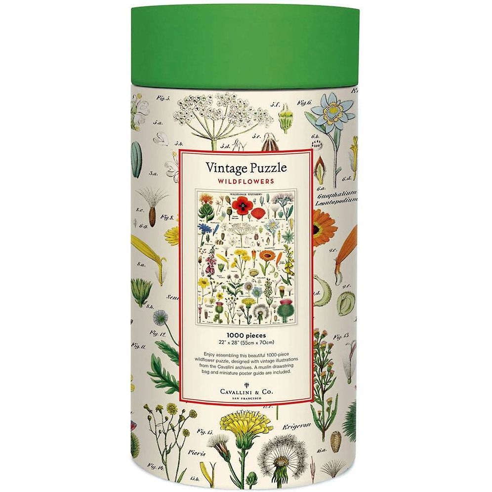This 1.000 piece jigsaw puzzle features vintage art of beautiful wildflowers. each with its scientific name alongside.