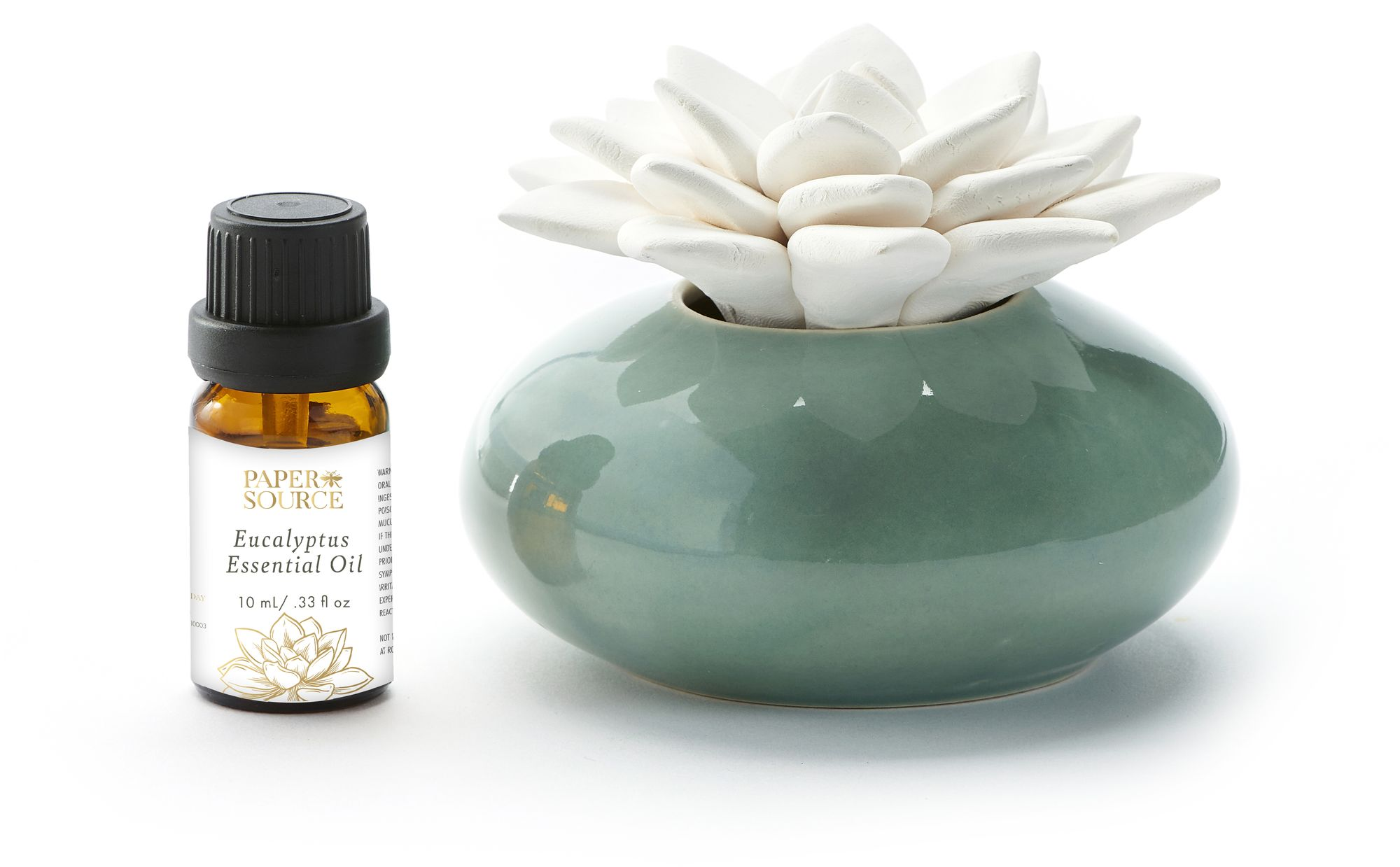 This lovely ceramic succulent diffuser is a decorative way to softly fragrance any room. It comes with a modern. sage green ceramic base with a white ceramic succulent flower topper that helps to diffuse the fragrance. Just add 2-3 drops of the provided Eucalyptus essential oil onto the ceramic flower and allow the scent to refresh your space.