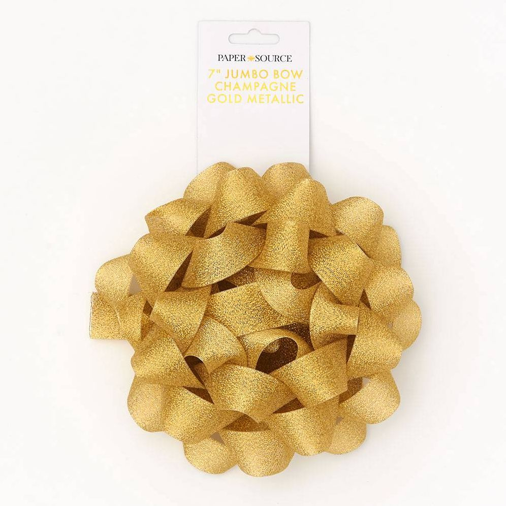 This jumbo champagne gold metallic bow will make any gift look stunning! Paper Source bows now come on recyclable cardboard backing.