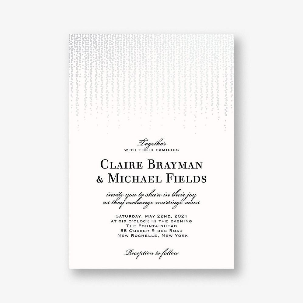 Reminiscent of a gilded chandelier. these invitations display a gorgeous design that your guests won’t resist. Delicate foil descends from the top of each invite. This design features Claire & Michael as shown. but will be customized featuring the names of your choice. Printed on Mohawk superfine white 130 lb. card stock that is soft to the touch and matches our superfine white envelopes. Paper is FSC certified and made using wind power.