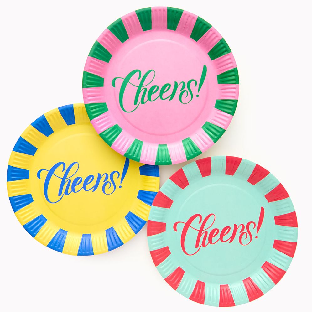 Set of 12 paper plates featuring colorful stripes and Cheers sentiment. great for any gathering! PS Exclusive.