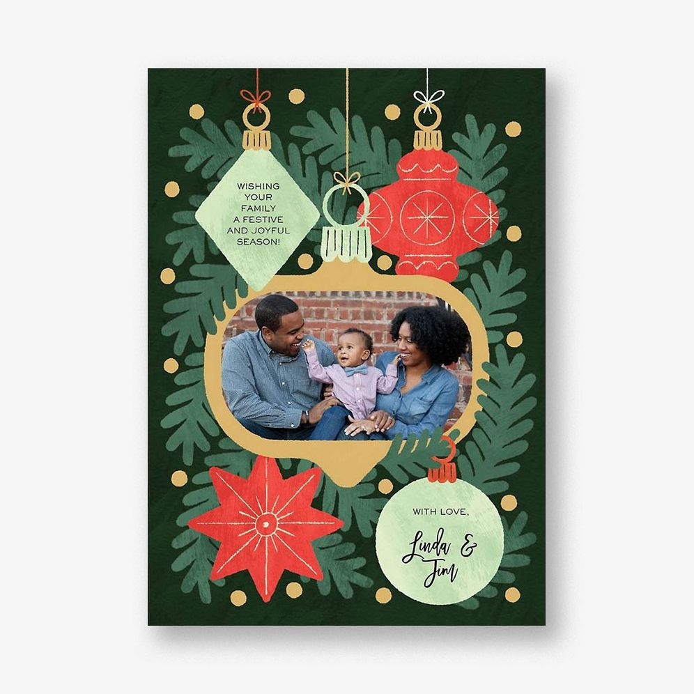 Featuring a charming arrangement of festive Christmas bulbs. this card provides the perfect backdrop for your favorite photos. Printed on Mohawk 120.0 lb Superfine Ultra White. This paper is FSC certified. with 30% post consumer recycled content. and made using wind power. Please note: Due to the matte finish of our paper. photos may print slightly darker than they appear on your screen.