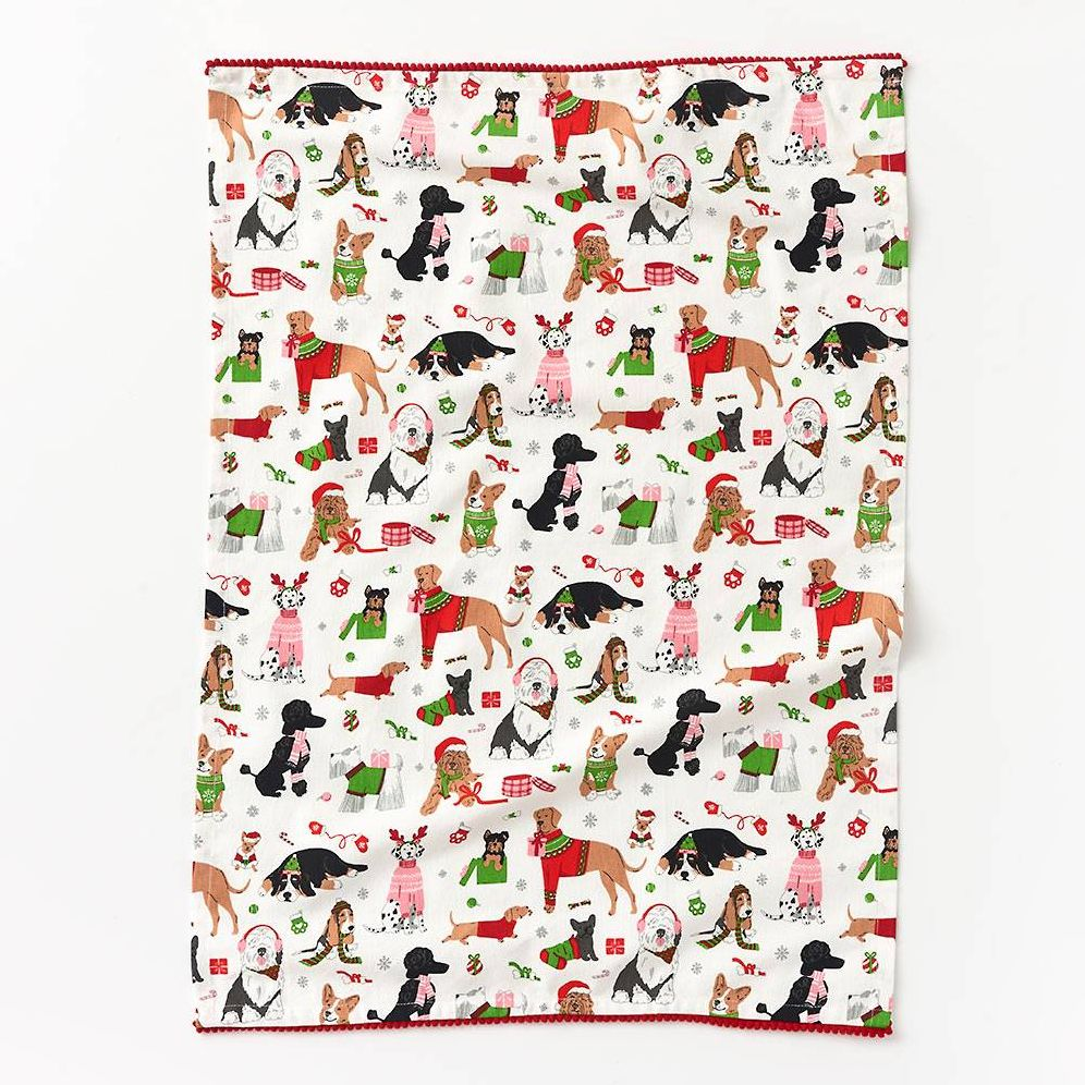 Holidays can be ruff. but not with our Good Boys Tea Towel! Featuring an adorable dog and holiday print and pom detail trim.