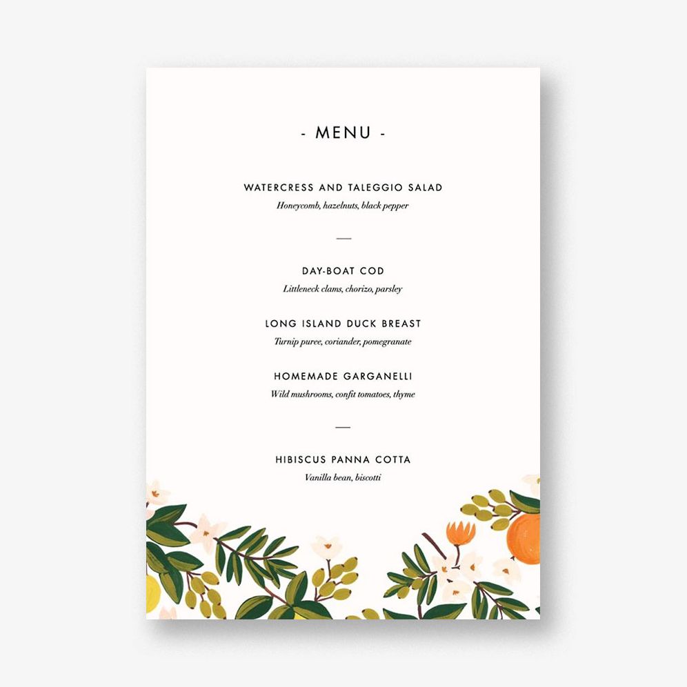 Share your menu on your big day with this colorful and fun Rifle Paper Co. for Paperless Post wedding design. Featuring a floral border in shades of green. orange. pink and yellow on a white or teal background. Printed on Mohawk superfine white 130 lb. card stock that is soft to the touch and matches our superfine white envelopes. Paper is FSC certified and made using wind power.