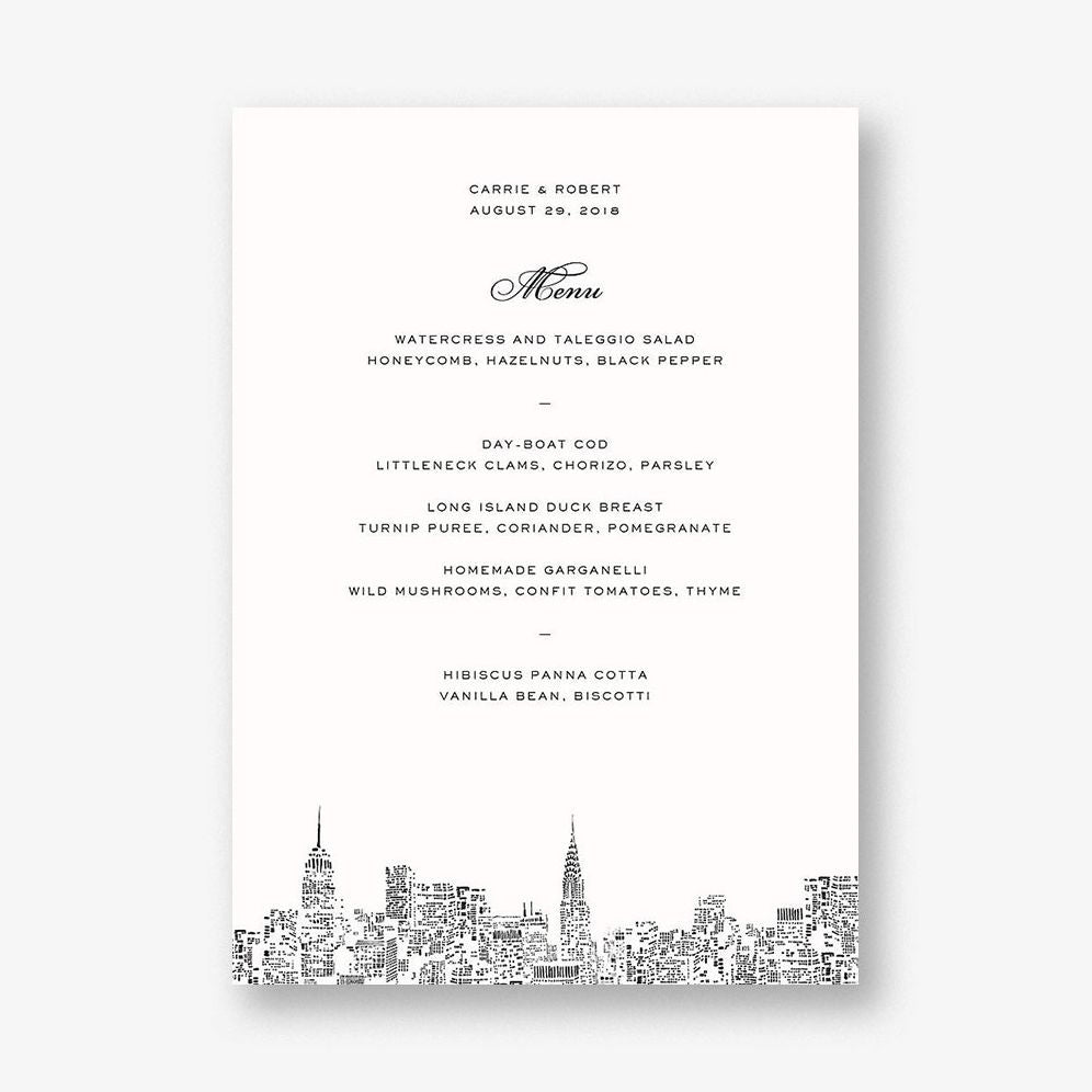The City Lights II Menu showcases an artistic representation of the New York City skyline and is a part of the City Lights II suite of wedding cards designed by kate spade new york for Paperless Post. Printed on Mohawk superfine white 130 lb. card stock that is soft to the touch and matches our superfine white envelopes. Paper is FSC certified and made using wind power.