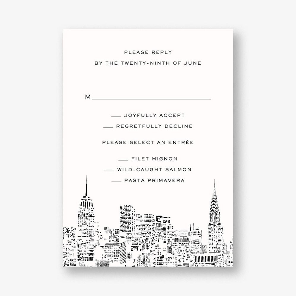 Share the essence of a magical night with this cityscape wedding response card by kate spade new york for Paperless Post. The etched city skyline detail gives these wedding RSVPs an added touch of elegance. Printed on Mohawk superfine white 130 lb. card stock that is soft to the touch and matches our superfine white envelopes. Paper is FSC certified and made using wind power.