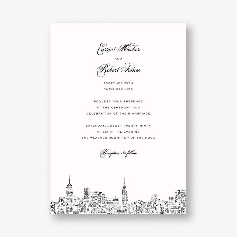 Share the essence of a magical night with this cityscape wedding invitation by kate spade new york for Paperless Post. The etched city skyline detail gives these invites an added touch of elegance. Printed on superfine white paper. which has a smooth finish and is soft to the touch. 130# cover weight paper with 30% post consumer recycled content.