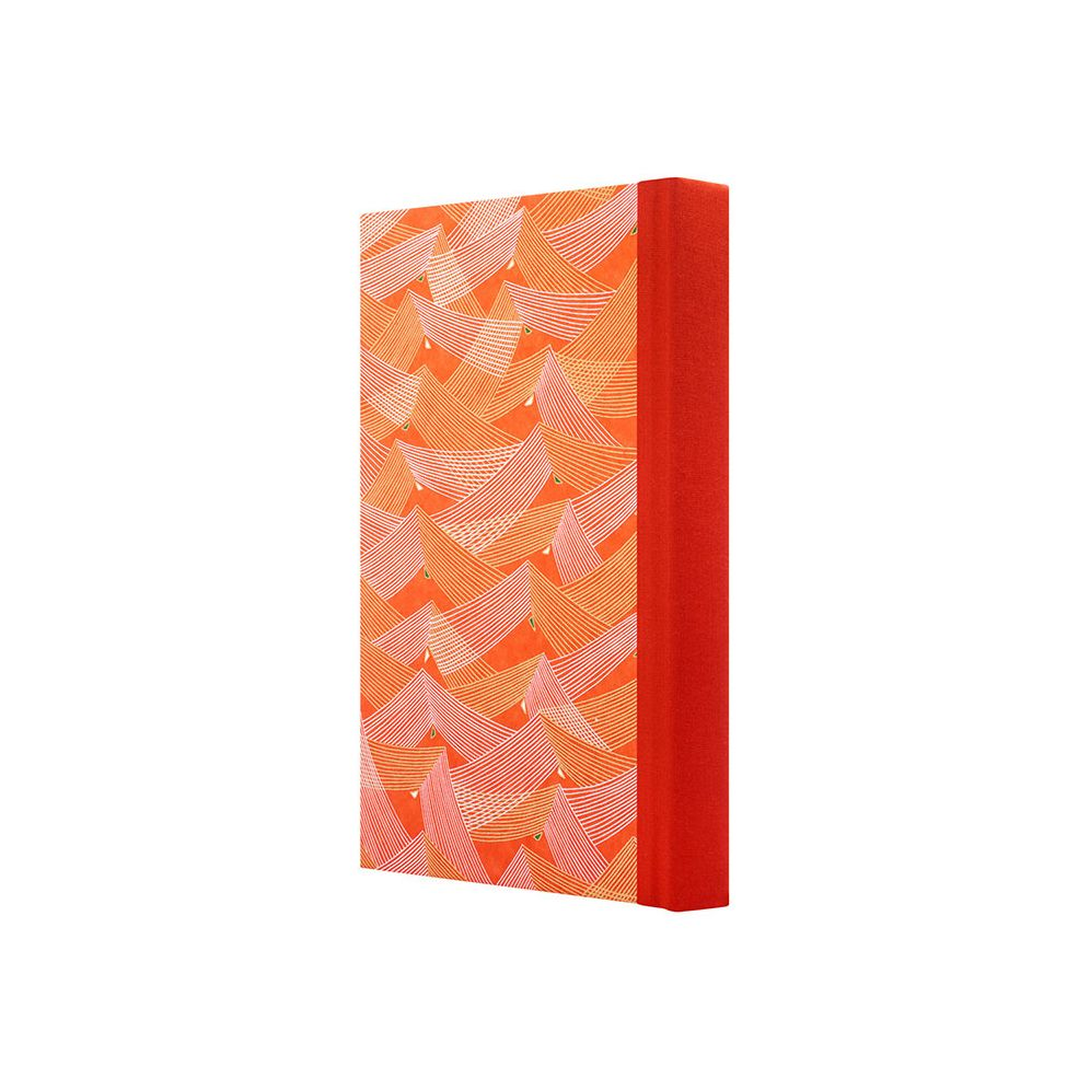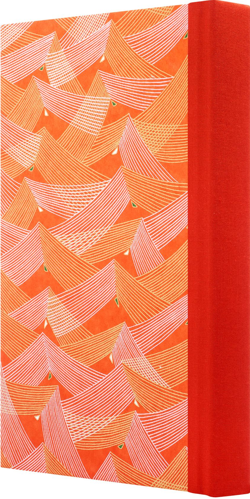 Featuring 112 lined luxury smooth leaves. carefully selected to ensure your writing instrument can glide across the page. Hand-bound in our bindery in the South of England in a beautiful silk screen printed paper selected from an archive of designs in Kyoto Japan. and finished with a co-ordinating coloured cloth spine for added durability. This journal features an abstract geometric wave design. made up of interwoven concentric lines in metallic gold and white. against a solid orange background. This paper features a gold accent screen. that gives it a truly opulent finish.
