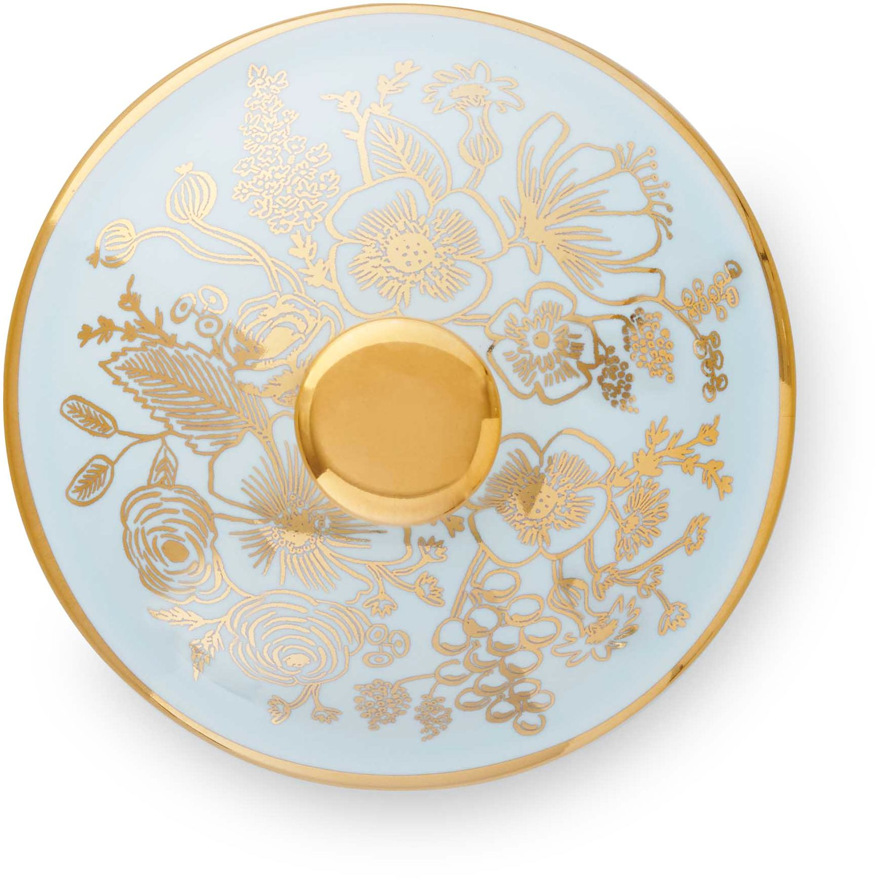 Store all your tiny treasures in this porcelain lidded box by Rifle Paper Co.. perfectly sized for change or jewelry. The box features gold foil floral designs on a mint background. with gilded edges and handle for extra shine.