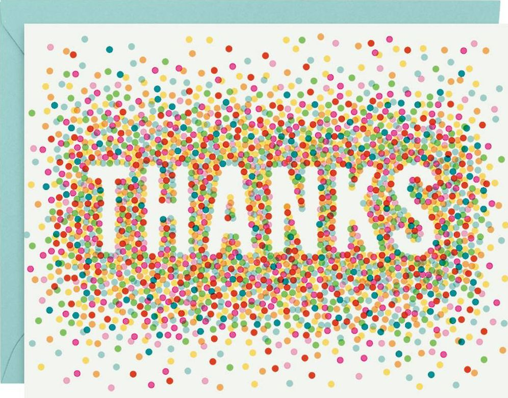 A colorful and fun way to express your gratitude! This thank you card set features an explosion of rainbow confetti with THANKS boldly written in white. Send in the mail or pair with a lovely gift of thanks. Blank inside. Envelope color may vary. Designed by Paper Source.