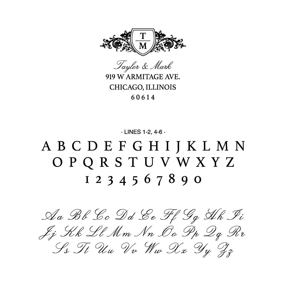 Your stamp plate will be produced with the capitalization and font shown in the sample.