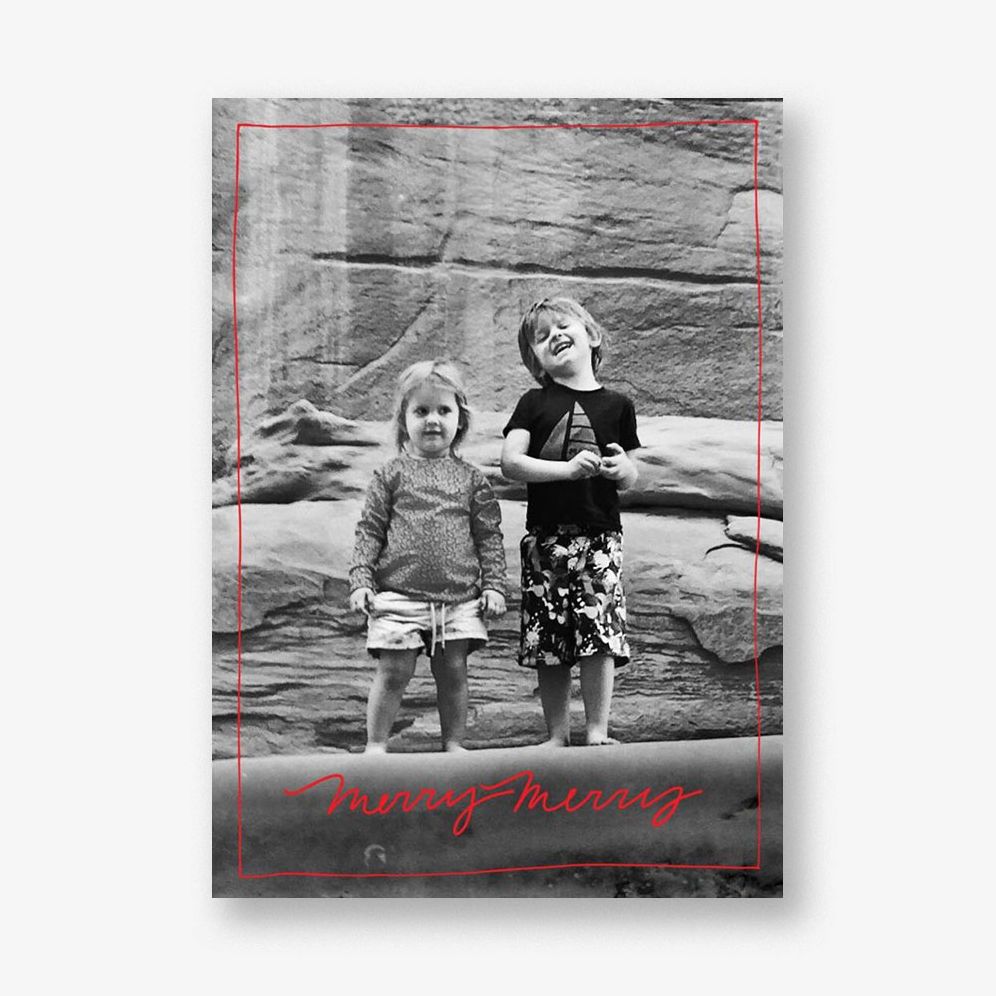 Frame your babies or fur babies inside this quirky bordered holiday photo card by Linda and Harriett for Paperless Post. This imperfectly perfect holiday card reads Merry Merry or Happy Holidays and is perfect to share with family and friends.
