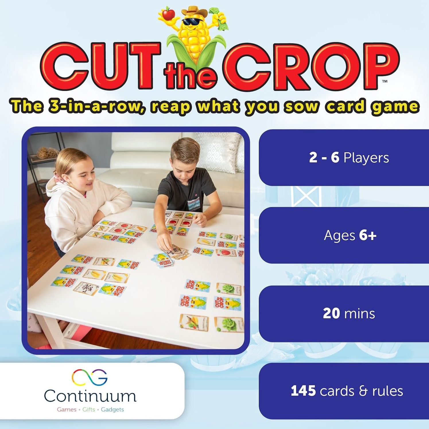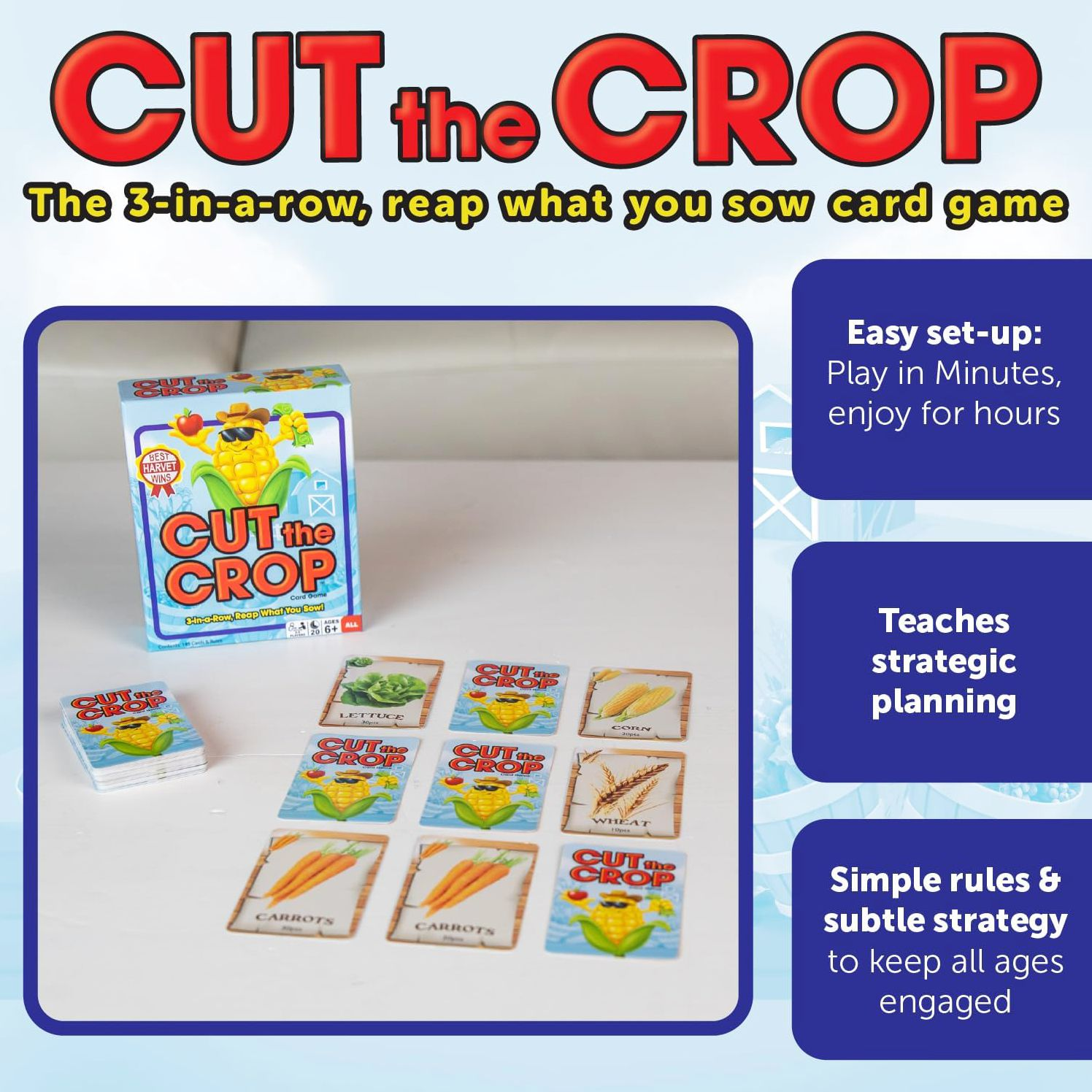 In Cut the Crop card game. you reap what you sow. You are a farmer working your fields to plant and harvest the most valuable crops. Plant three matching crops in a row and you can harvest them to score points. Be careful not to pass along crops your opponents need. Also look to harvest crops on contract or in the market to score bonus points. Do you harvest easy points now or hold for higher points later? The player who manages their fields best wins.