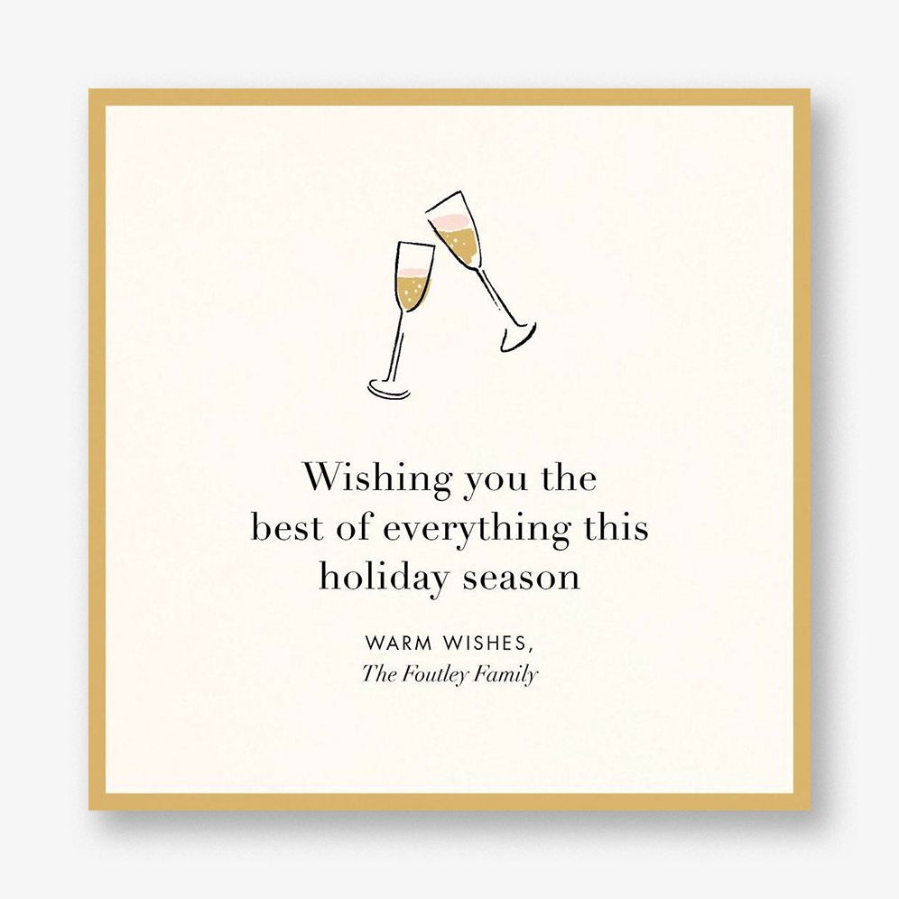 Let those you love know that you’re thinking of them with this personalized holiday card from kate spade new york by Paperless Post. This card pictures two champagne glasses cheers-ing and can be further customized with a message from you and your family. Note: Mailing square cards to your recipients will require additional postage. Printed on Mohawk ultra white 120 lb. card stock that is soft to the touch and matches our superfine white envelopes. Paper is FSC certified and made using wind power.