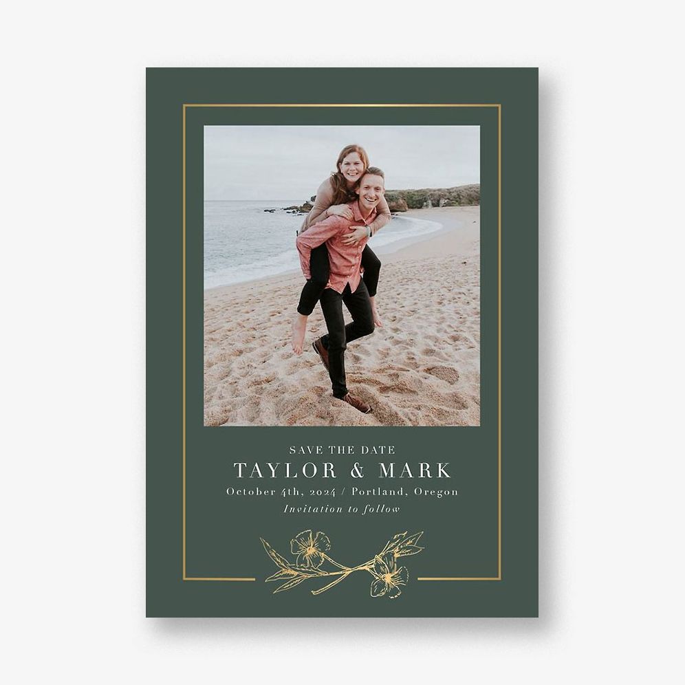 A delicate gold foil floral motif adorns your wedding details on the Cypress Flower Frame Foil Save the Date Card. designed in-house at Paper Source.