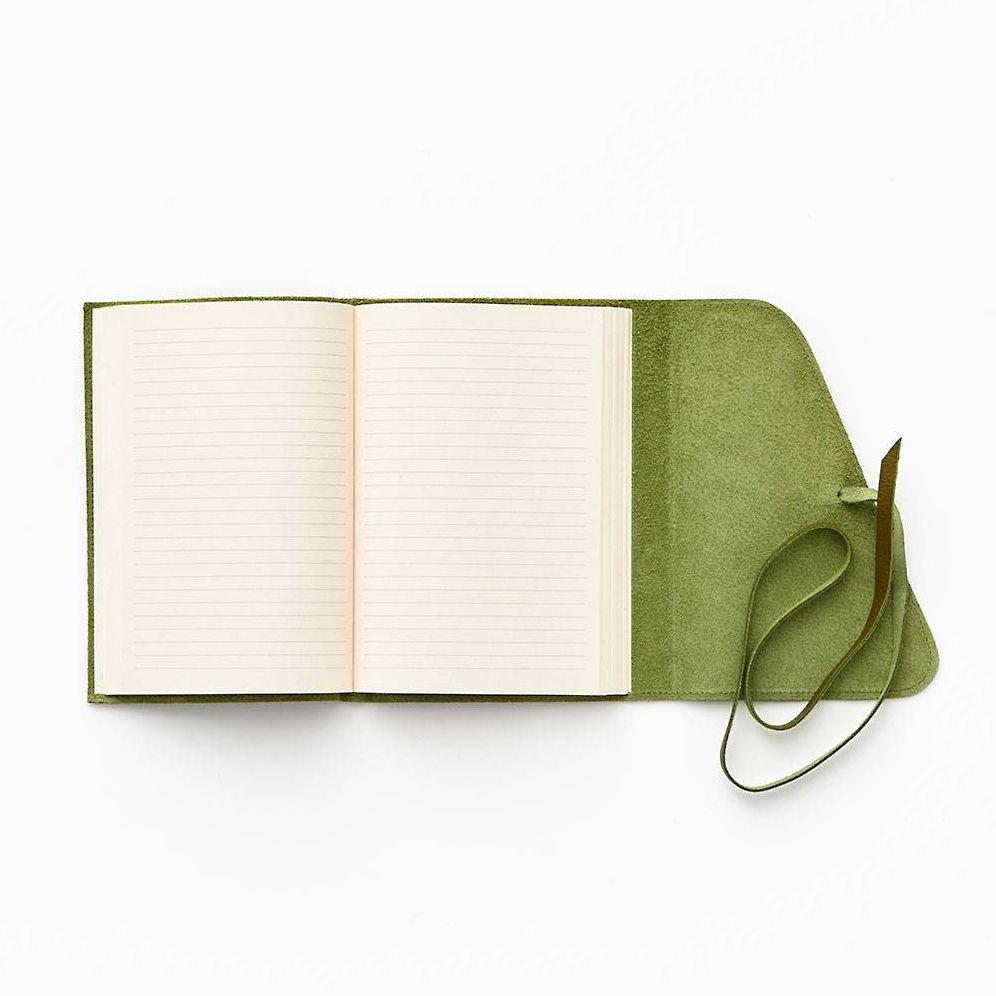6×8 journal with 128 lined ivory pages. made in soft barrel-dyed nubuk leather. with contrasting wrapping tie.