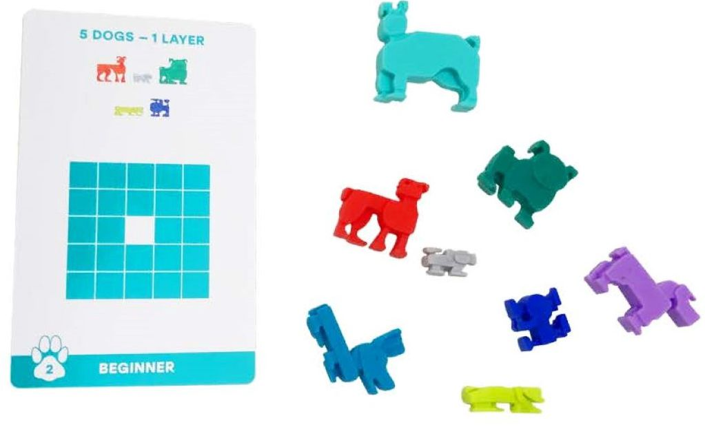 Dog lovers will beg for this cute spatial perception puzzle. Select one of the 48 challenge cards. ranging from beginner to expert. and arrange the dog puzzle pieces so that they fit precisely onto the grid. Each colorful dog is a unique shape; you have to figure out how to nest them together. To make it even more challenging. many levels involve multiple layers!