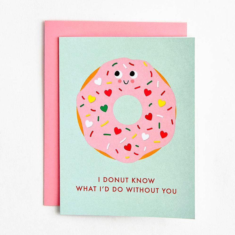 A sweet card to share with your sweetie this Valentine’s Day! The illustration on this mint card features a donut with pink icing and sprinkles and reads ‚ÄúI donut know what I’d do without you‚Äù.