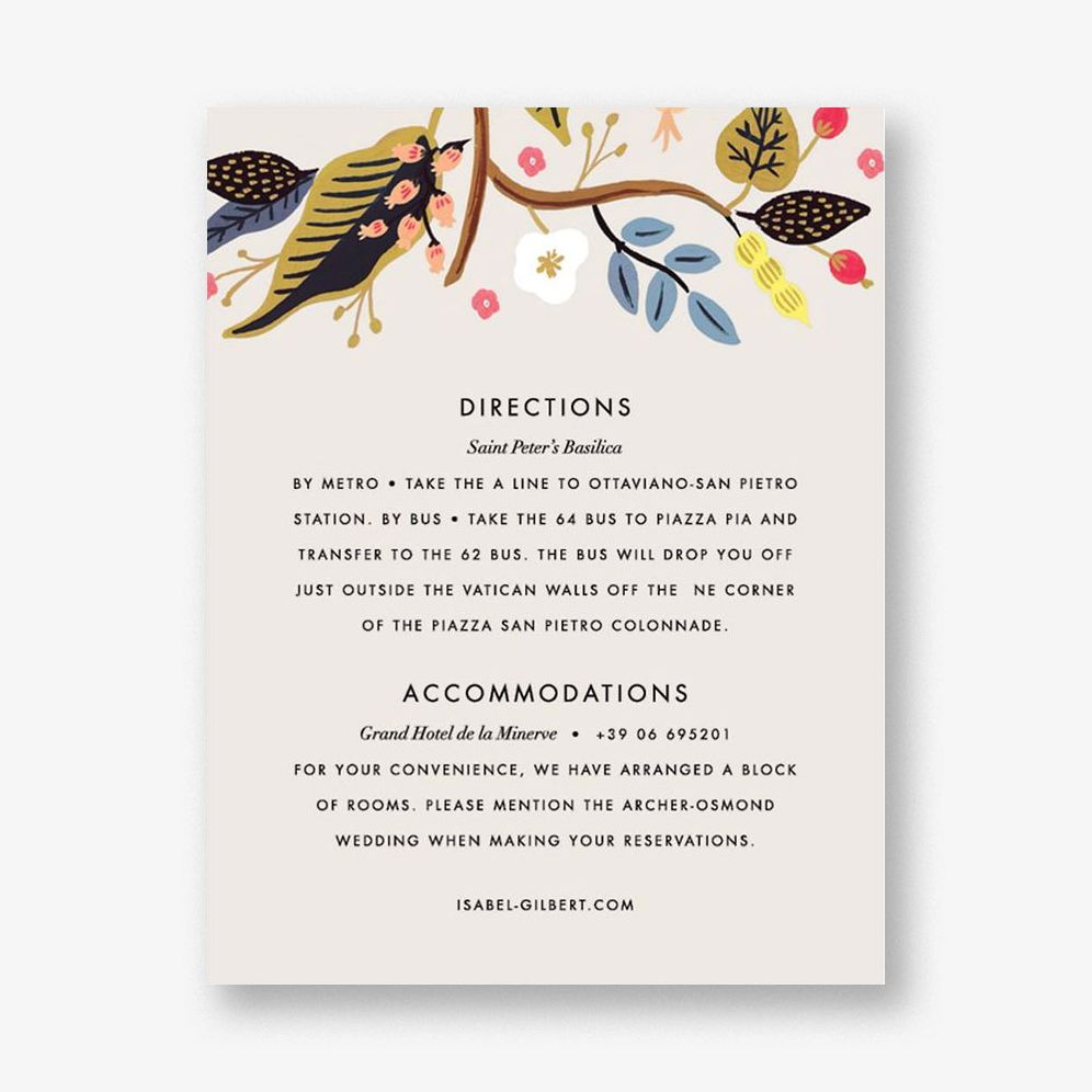 This two-toned wedding information card by Rifle Paper Co. for Paperless Post is perfect to give all those you love the information to celebrate your big day. Bordered with colorful florals with a place in the center to add all your event details. Printed on Mohawk superfine white 130 lb. card stock that is soft to the touch and matches our superfine white envelopes. Paper is FSC certified and made using wind power.