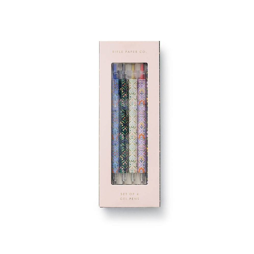 Make note-taking a whole lot brighter with Rifle Paper Co. set of 4 retractable gel pens. Each pen has a different ink??blue. black. red. and metallic gold??with coordinating Estee florals.