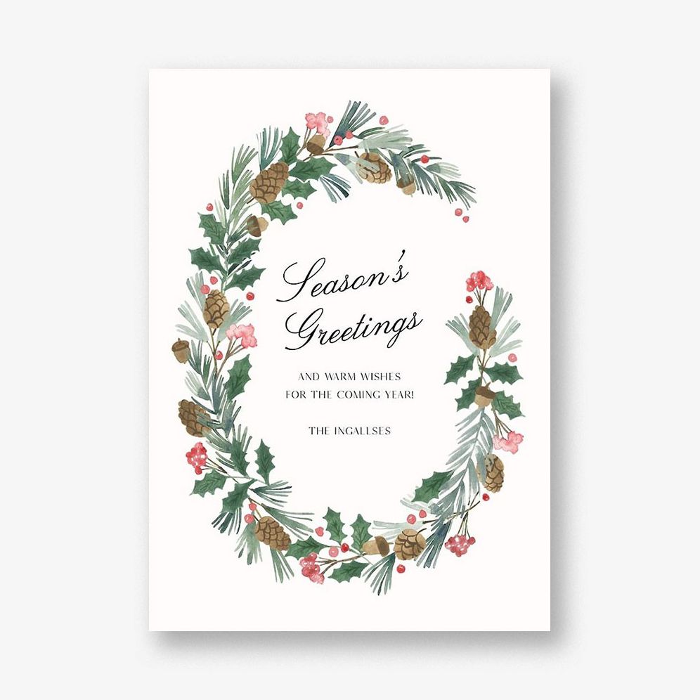 This card features a charming farmhouse-inspired garland that evokes feelings of coziness and tradition. Printed on Mohawk 120.0 lb Superfine Ultra White. This paper is FSC certified. with 30% post consumer recycled content. and made using wind power.