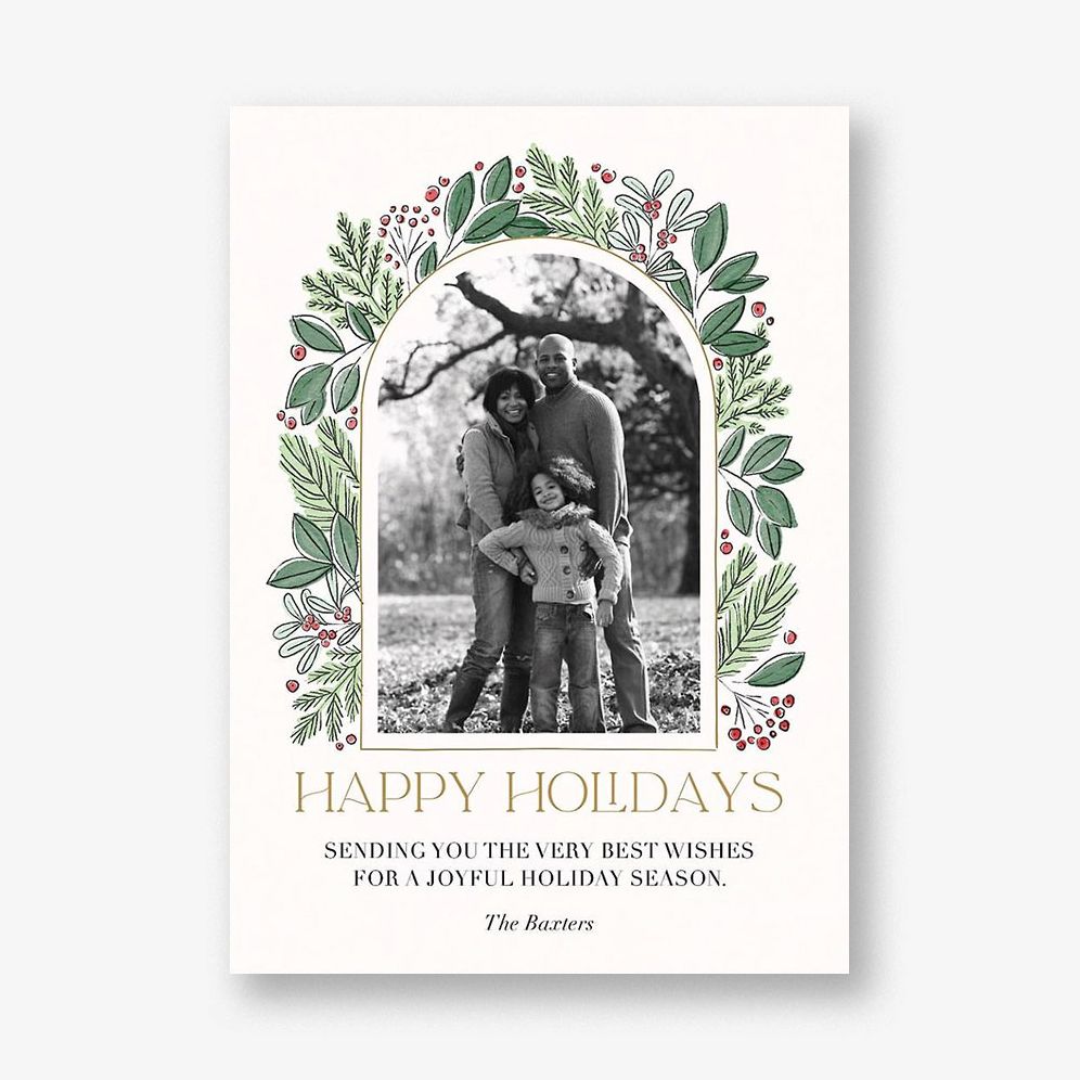 Let those you love know that you’re thinking of them with this personalized holiday photo card by Paperless Post. This card reads Happy Holidays and can be further customized with a message from you and your family. Printed on Mohawk ultra white 120 lb. card stock that is soft to the touch and matches our superfine white envelopes. Paper is FSC certified and made using wind power.