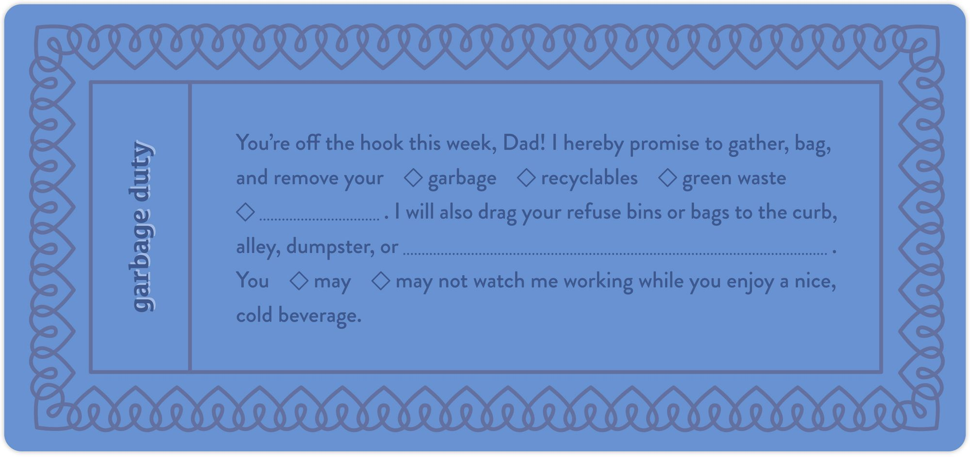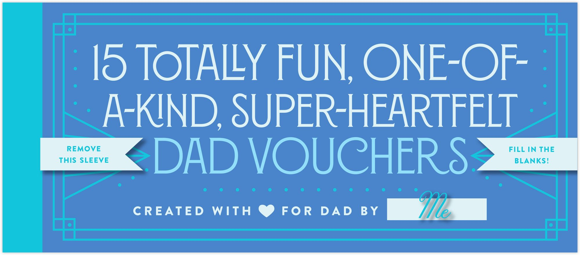 Let Dad know he’s loved. appreciated?Cand not just someone who grills a mean kabob and tried to make you learn drums so you could play in his band?Cwith this dazzling booklet of personalizable. feel-good coupons. Simply fill out all 15 vouchers and hand ’em over to be cashed in anytime for props. favors. fun. bonding. and some well-earned high fives.