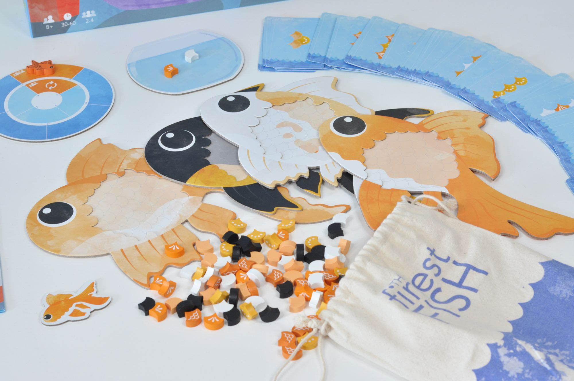 Create the finest fish in the national goldfish show by adding colorful wooden scales to your goldfish game board. Be the player to earn the most points by including clusters of same-colored scales and completing pattern cards before your opponents in this casual. yet strategic tile drafting. tile placement game. Each turn you’ll choose new scales from among a few random sets available. As you add the scales to your fish you may trade them with any other scales found in the public fishbowl. or even spend those scales to buy new pattern cards. Place scales in clusters of the same color or complete (and purchase) pattern cards to score points.