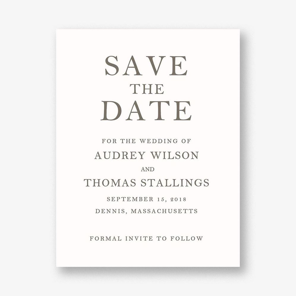 A sophisticated font presents your names boldly typed on these Save The Date Cards. They’re sure to get your friends and family excited for your big day! This design features Audrey & Thomas as shown. but will be customized featuring the names of your choice. Printed on Mohawk superfine white 130 lb. card stock that is soft to the touch and matches our superfine white envelopes. Paper is FSC certified and made using wind power.